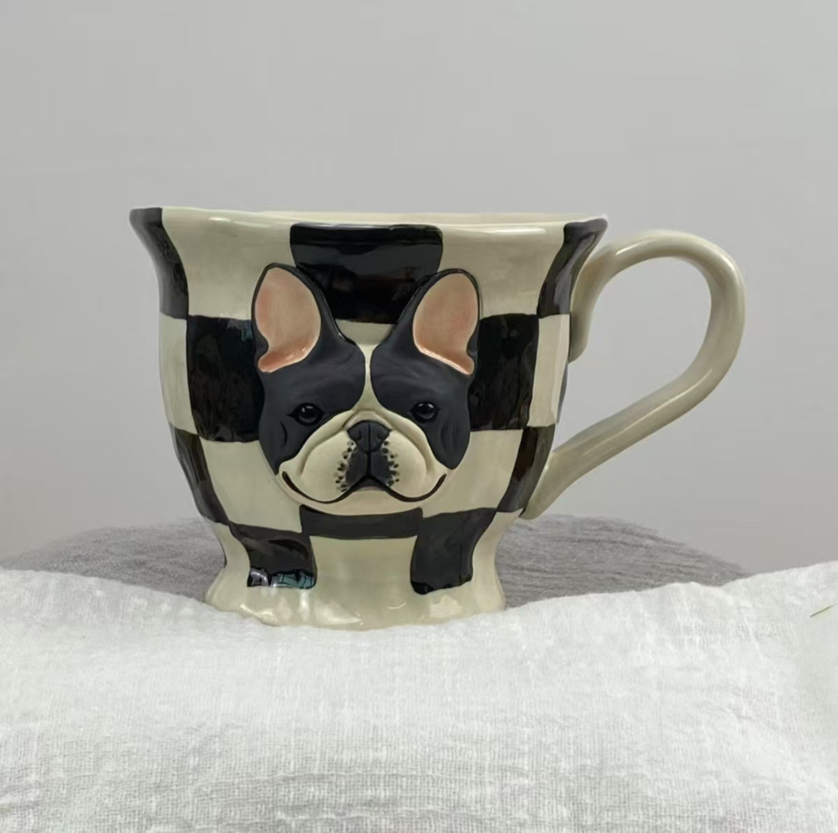 This handcrafted ceramic coffee mug features an irresistibly cute 3D French Bulldog peeking out from a playful checkered design. Each cup is carefully hand-painted, making every piece a unique expression of artisan charm.