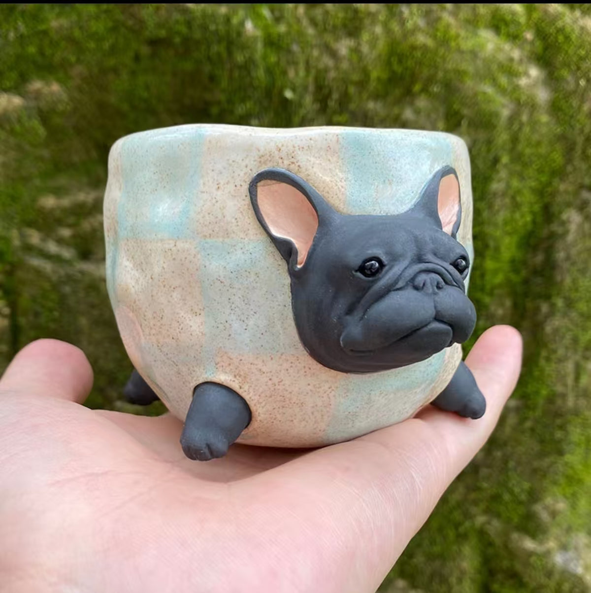 This cup features a charming black French Bulldog with a soft blue checkered pattern, showcasing the exquisite artistry of handcrafted ceramics. Each cup is carefully sculpted by artisans, with intricate details and a whimsical design that will appeal to dog lovers and ceramic enthusiasts alike. Whether enjoying your morning coffee or afternoon tea, this cup will add warmth and character to your beverage experience.